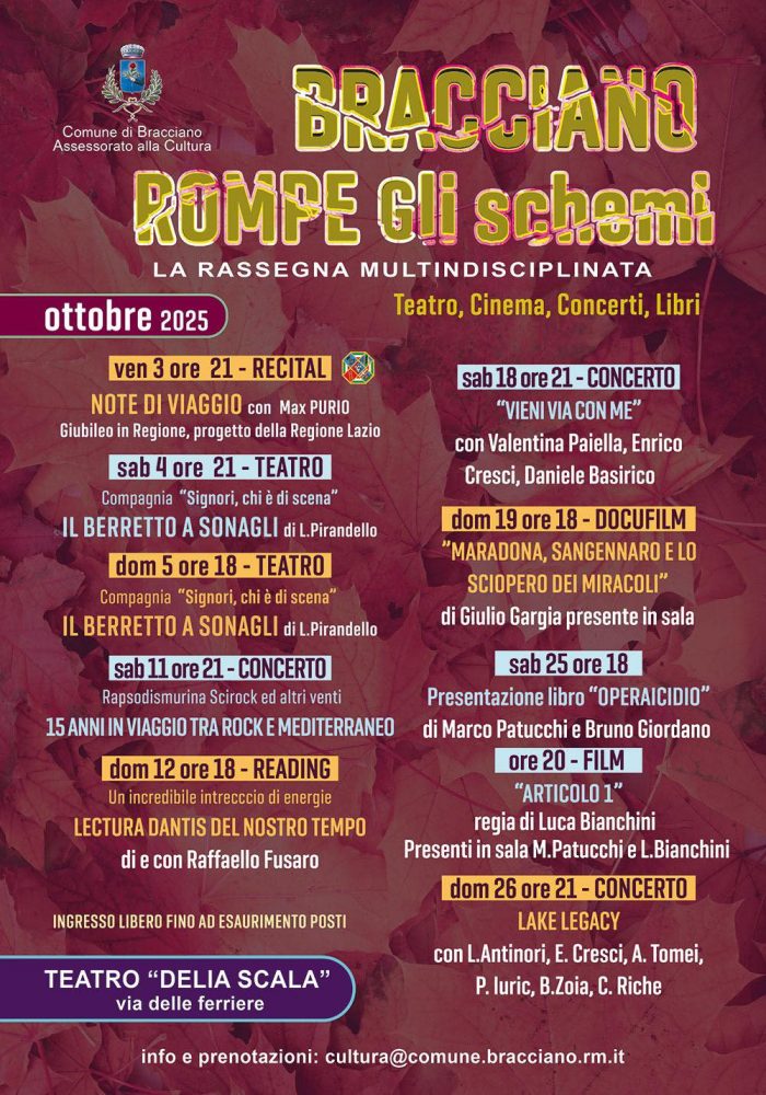 Bracciano si prepara a vivere un ottobre all’insegna della cultura e della creatività con una rassegna multidisciplinare unica nel suo genere, che animerà il prestigioso Teatro del Lago Delia Scala in via delle Ferriere. Bracciano, rompe gli schemi, dal 3 al 28 ottobre 2025, farà sì il teatro diventerà un crocevia di arti, con un calendario ricco di eventi che spaziano dal teatro al cinema, dalla musica alla letteratura.