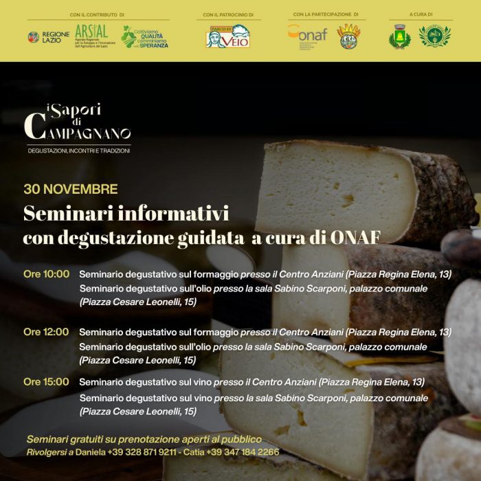 A Campagnano di Roma, nell’ambito del progetto I Sapori di Campagnano, sabato 30 novembre si svolgeranno i Seminari Informativi con Degustazione Guidata a cura di ONAF – Organizzazione Nazionale Assaggiatori Formaggi.