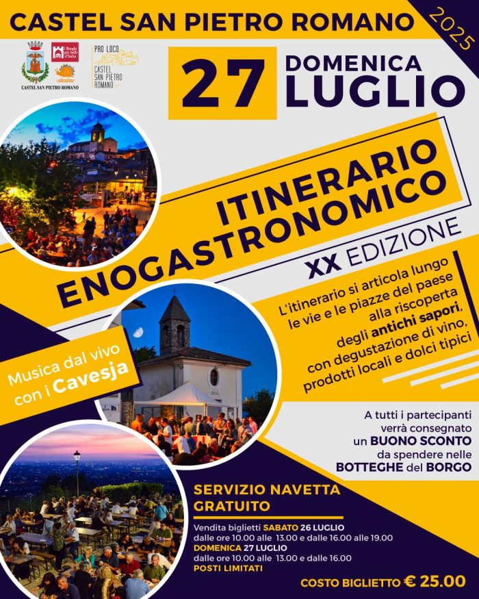A Castel San Pietro Romano, domenica 27 luglio, le vie e le piazze del suggestivo centro storico torneranno a risuonare di convivialità e profumi autentici in occasione della XXª edizione dell’Itinerario Enogastronomico, una delle feste più amate del territorio.