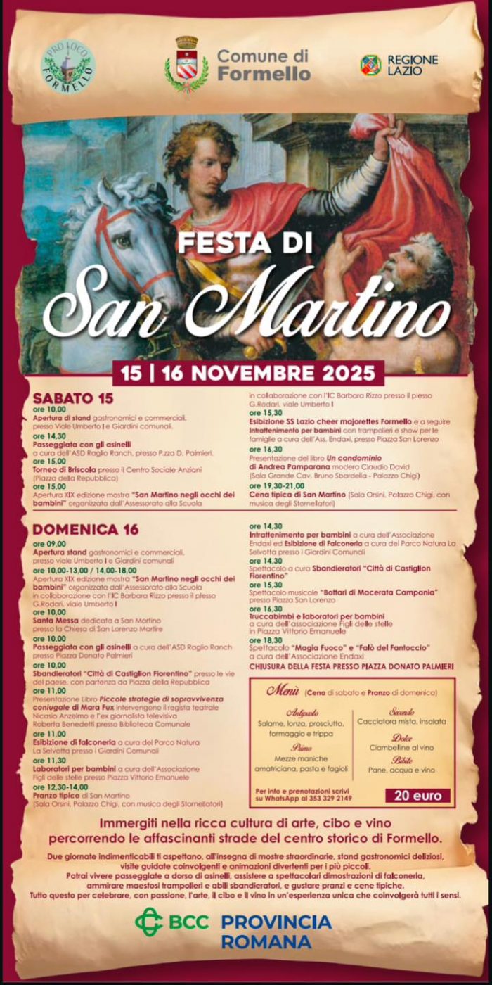Il centro storico di Formello si prepara ad accogliere uno degli appuntamenti più amati dell’anno: la Festa di San Martino, in programma sabato 15 e domenica 16 novembre 2025.
