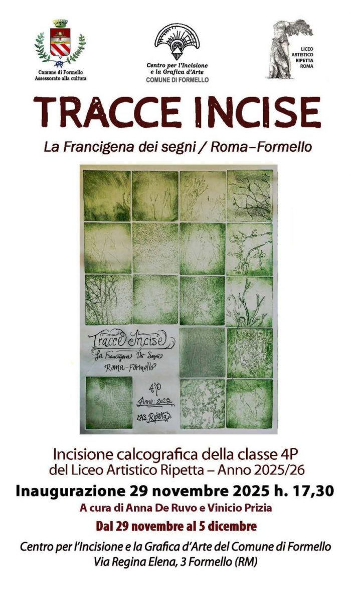 A Formello, dal 29 novembre al 5 dicembre presso il Centro per l’Incisione e la Grafica d’Arte, si potrà visitare la mostra Tracce Incise – La Francigena dei segni / Roma–Formello, realizzata dagli studenti della classe 4P del Liceo Artistico Ripetta di Roma nell’ambito della rassegna Incisione e… 2025.