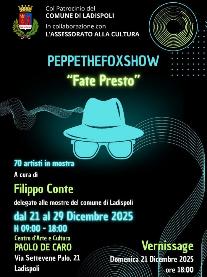 Ladispoli si prepara ad accogliere un appuntamento di grande rilievo artistico e culturale. Domenica 21 dicembre, alle ore 18:00, il Centro d’Arte e Cultura Paolo De Caro, ospiterà la Collettiva del Peppethefoxshow, rassegna dal forte impatto concettuale intitolata Fate presto.