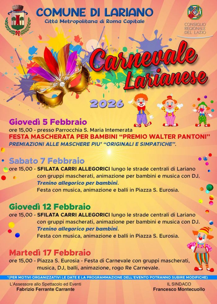 A Lariano, anche nel 2026 il Carnevale Larianese torna ad animare la città con una serie di appuntamenti che uniscono tradizione, creatività e partecipazione popolare. Le celebrazioni si svolgeranno nelle giornate del 5, 7, 12 e 17 febbraio, trasformando le strade e le piazze in un grande palcoscenico a cielo aperto, tra colori, musica e allegria.