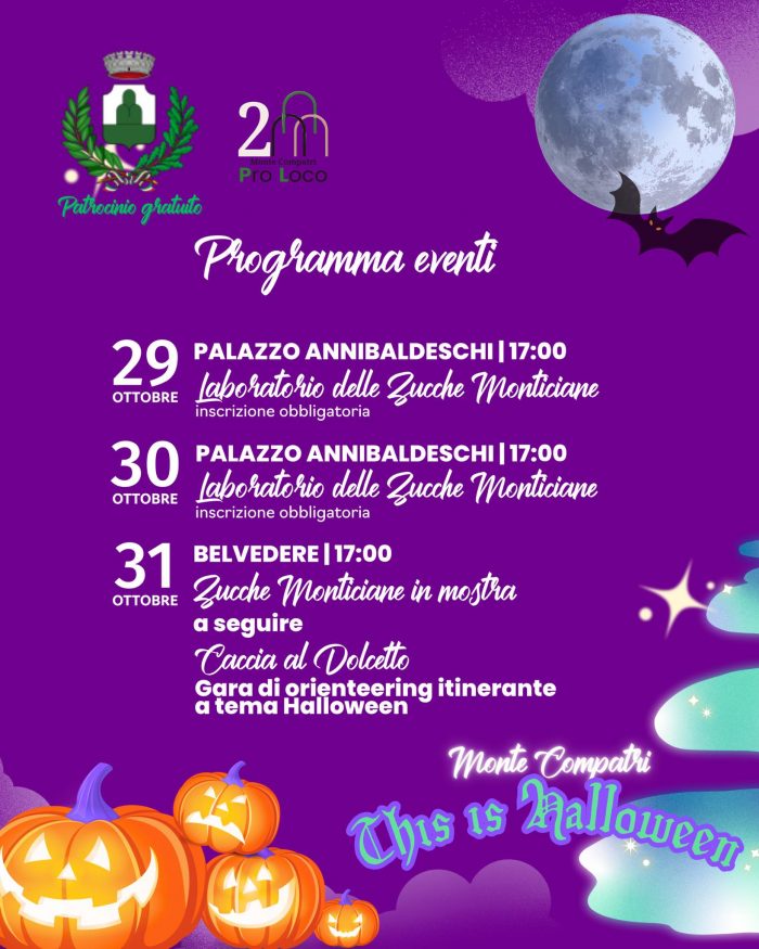 Martedi 29 e mercoledi 30 ottobre, dalle ore 17:00, si terrà presso Palazzo Annibaldeschi il tradizionale Laboratorio delle Zucche Monticiane, dove i partecipanti potranno dare libero sfogo alla fantasia intagliando e decorando le proprie zucche. La partecipazione è gratuita ma l’iscrizione è obbligatoria.