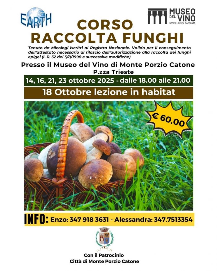 Monte Porzio Catone torna a ospitare uno degli eventi più attesi dagli appassionati di natura e gastronomia: il Corso di Raccolta Funghi, organizzato da EARTH odv con il patrocinio dell’amministrazione comunale.
