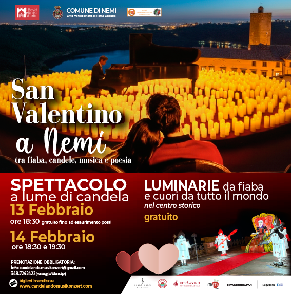 Il borgo di Nemi si prepara a celebrare la festa degli innamorati con San Valentino a Nemi – tra fiaba, candele, musica e poesia, un’iniziativa che il 13 e 14 febbraio trasformerà le strade del centro storico in un’atmosfera romantica e senza tempo. Il percorso nel borgo sarà arricchito da oltre cento installazioni luminose dedicate alle fiabe, cuori provenienti da tutto il mondo e scenografie artistiche che guideranno i visitatori in un viaggio emozionale aperto a tutti e completamente gratuito.