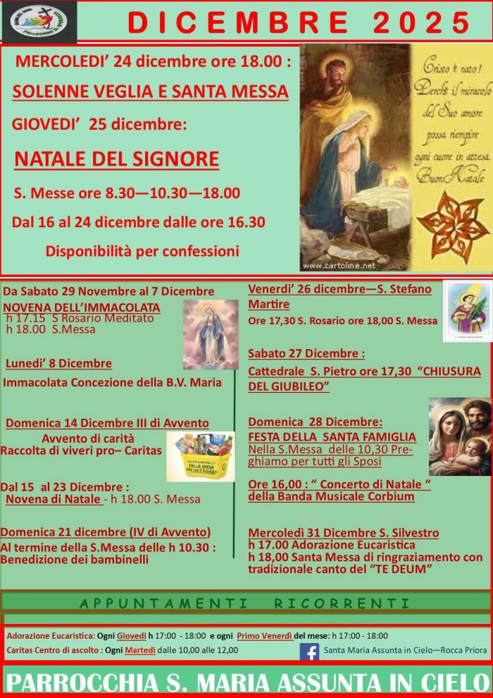 Nel mese dedicato al Santo Natale, a Rocca Priora è previsto un ricco calendario di appuntamenti della liturgia natalizia. Promosso dalla Parrocchia Santa Maria Assunta in Cielo, il ricco programma è stato pensato per accompagnare l’intera comunità nel cammino di preparazione alla festa più attesa dell’anno.