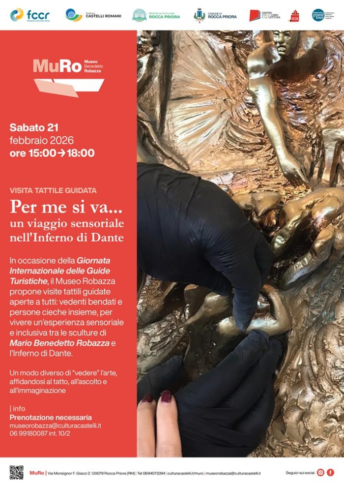 A Rocca Priora il 21 febbraio al Museo Robazza dalle 15:00 alle 18:00, in occasione della Giornata Internazionale delle Guide Turistiche, Per me si va… un viaggio sensoriale nell’Inferno di Dante, iniziativa dedicata all’accessibilità e alla fruizione inclusiva del patrimonio artistico.