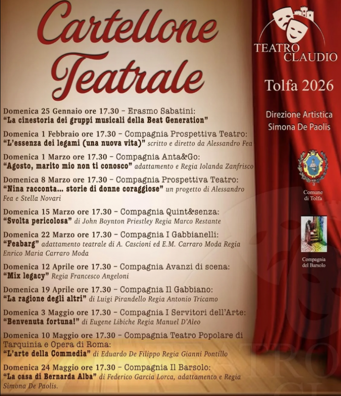 Situato nel cuore di Tolfa, il Teatro Claudio continua a rappresentare un presidio culturale fondamentale per la comunità, contribuendo alla valorizzazione del centro storico e alla promozione di una proposta culturale stabile e riconoscibile all’interno del territorio della Città metropolitana di Roma.
