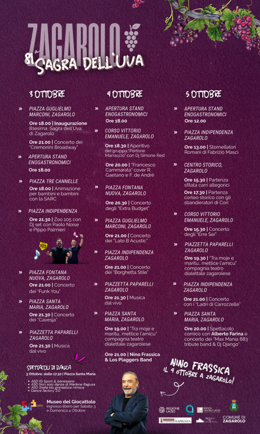 A Zagarolo, dal 3 al 5 ottobre una tre giorni di festa tra folklore, sapori locali e spettacoli gratuiti. L’evento, l’81ª edizione della Sagra dell’Uva, trasformerà il centro storico in un grande palcoscenico a cielo aperto, tra folklore, enogastronomia, cultura e spettacolo.