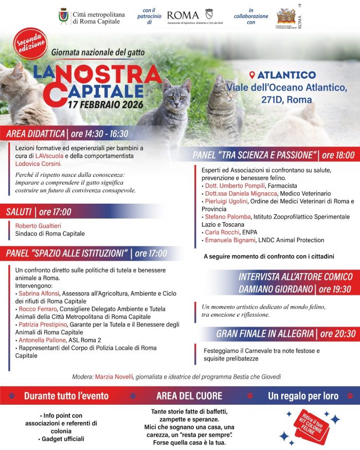 Giornata Nazionale del Gatto, l’evento di Città metropolitana di Roma Capitale all’Atlantico Live torna con la seconda edizione nel 2026: il 17 febbraio sarà un giorno intero dedicato ai felini e al profondo legame che li unisce alla città. Un’occasione per conoscere, condividere e rafforzare l’impegno verso la tutela e il benessere dei gatti dell’area metropolitana.