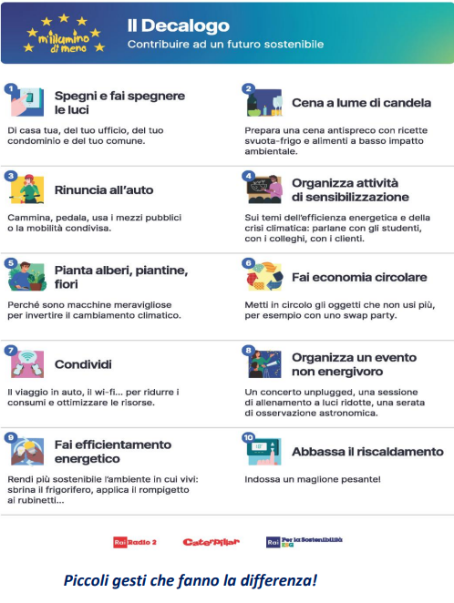 Tutti sono invitati a partecipare: dal Decalogo scegliete almeno un’azione antispreco, contribuendo a sensibilizzare al risparmio energetico e ad adottare stili di vita che fanno bene a se stessi e all’ambiente.