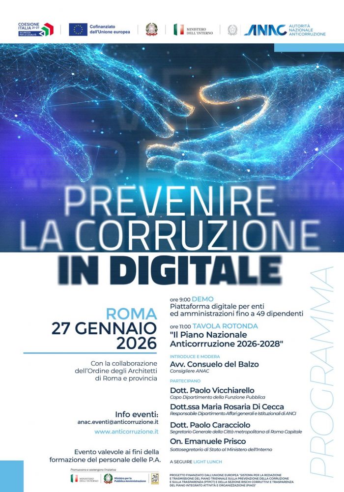 L’evento si terrà a partire dalle ore 9.00 del 27 gennaio 2026 presso l’Acquario Romano, sede dell’Ordine degli Architetti di Roma e Provincia, in Piazza Manfredo Fanti n. 47. Sarà illustrata la Piattaforma digitale per Enti ed Amministratori fino a 49 dipendenti e a seguire la tavola rotonda il “Piano Nazionale Anticorruzione 2026-2028”.