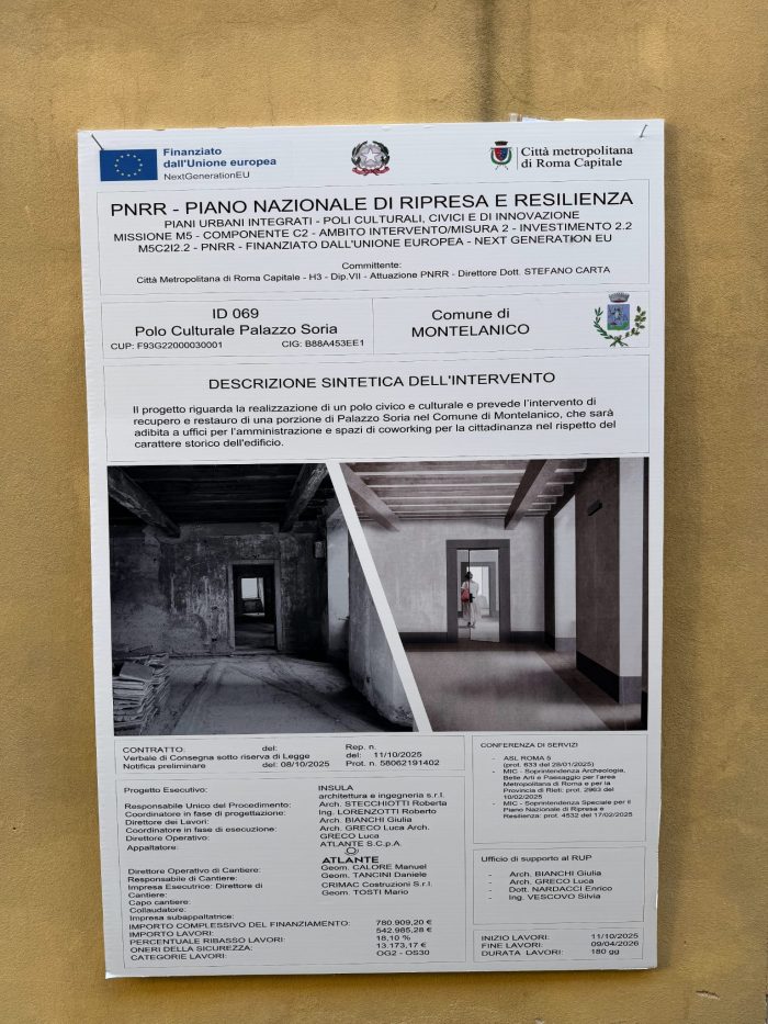 A Montelanico sono stati avviati i lavori di recupero dello storico palazzo Soria, acquisito dal Comune negli anni 90 il cui intervento di restauro, avviato negli anni 2000, non è mai stato portato a termine. Grazie ai fondi del PNRR – PUI Cultura, una parte significativa dell’edificio verrà recuperata e saranno ricostruiti spazi pubblici adibiti a uffici dell’amministrazione e co-working, con l’intenzione di inserire questo intervento nel quadro di un più ampio progetto di recupero del centro storico che l’amministrazione comunale guidata da Sandro Onorati sta portando avanti, a salvaguardia della storia e della cultura di un’area che nel tempo ha vissuto lo spopolamento e l’abbandono.